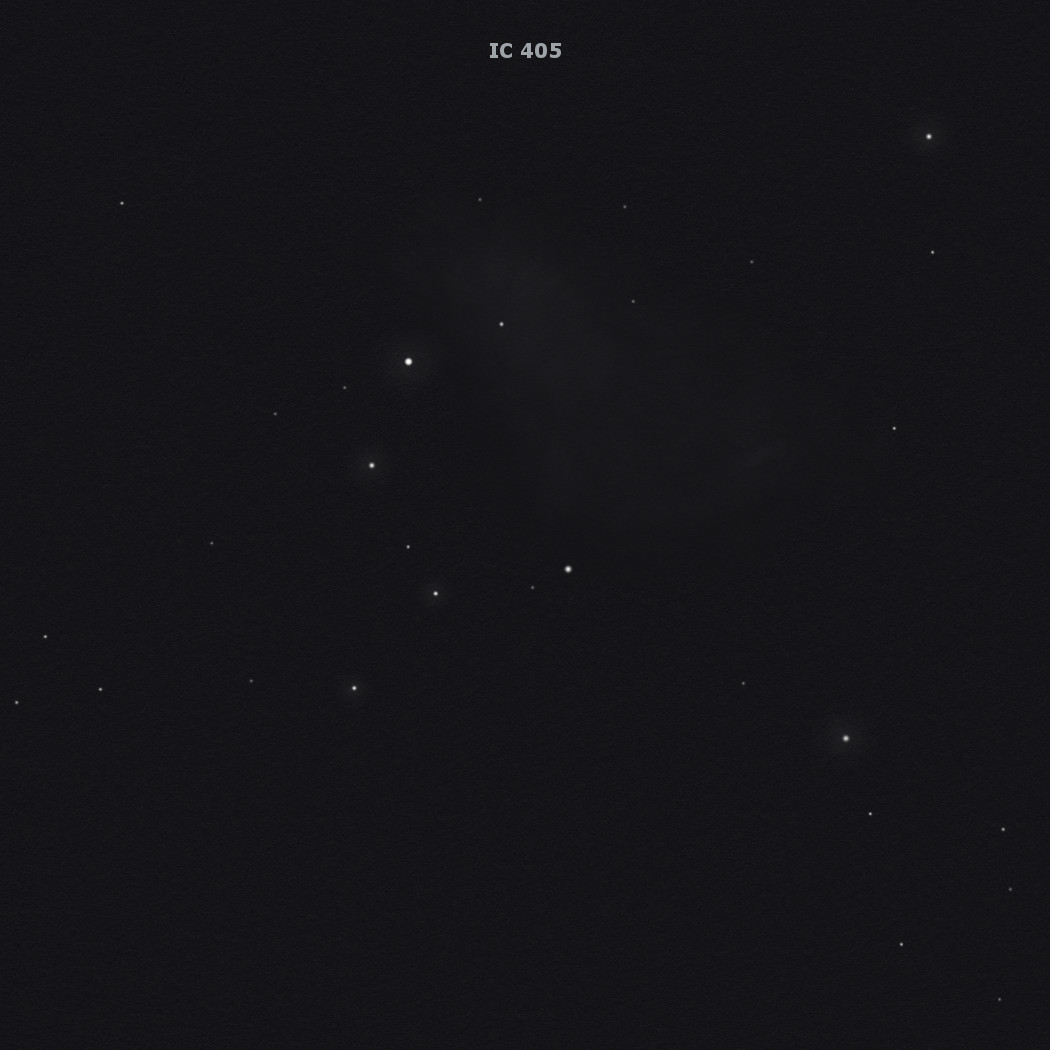 IC 405 (C31). The “Flaming Star Nebula” is quite faint and large. It requires a filter (UHC or H-Beta) to create a better contrast. The shape is more or less triangular and the nebulosity is most concentrated close to some bright stars. Left and above, the nebula is most bright, while on the right and underside in the sketch a small streak of brighter nebulosity is seen. More details are too uncertain to draw. Sketched with the 16″ Alkaid @91x.